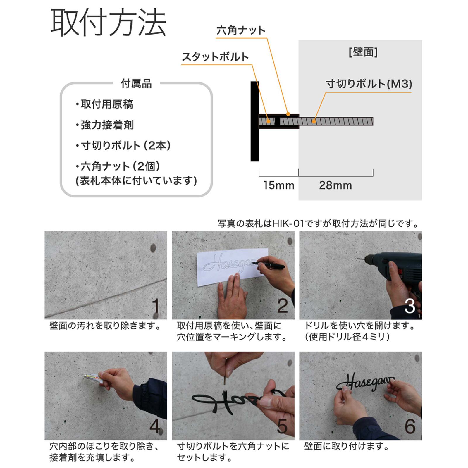 付属品:取り付け用原稿用紙、強力接着剤、寸切りボルト2本、六角ナット2個(表札本体に付いています)
